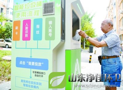建國門街道外交部街33號院居民正在使用新安裝的智能垃圾桶。小區內新設的6臺單體智能垃圾桶,可以進行人臉、指紋識別,還可以刷積分卡,方便居民更好地分類投放廚余垃圾,同時還能及時記錄每個用戶參與分類的頻次和數量。本報記者 和冠欣攝